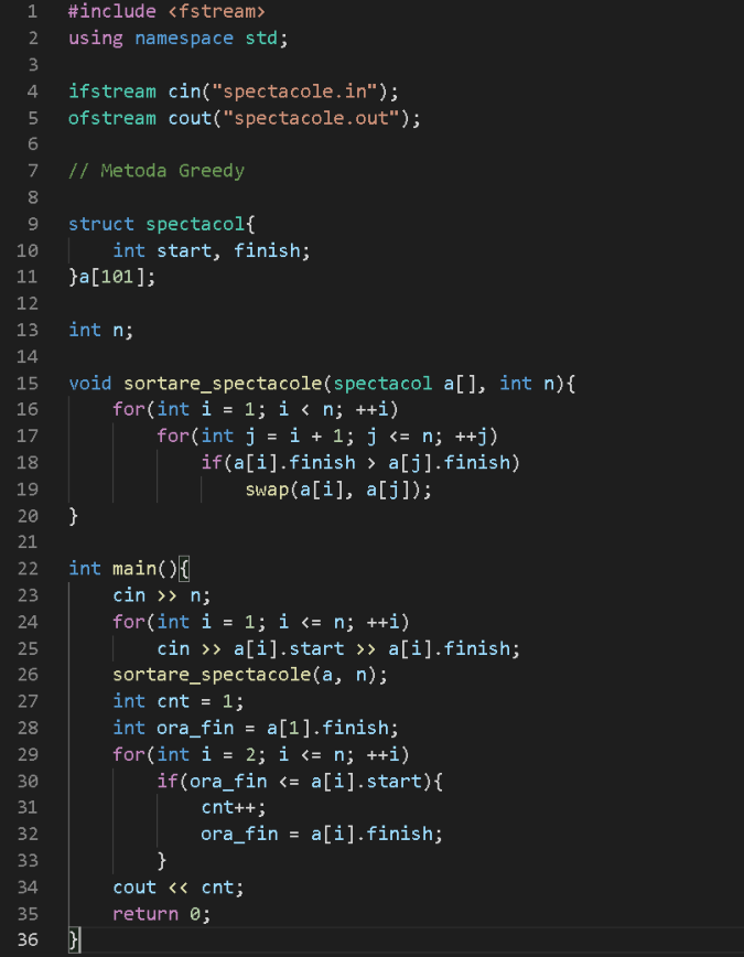 nspectacole. Pentru fiecare se cunoaște momentul de început și momentul de sfârșit, exprimate prin numere naturale. Un spectator dorește să urmărească cât mai multe spectacole în întregime. Determinați numărul maxim de spectacole care pot fi urmărite, fără ca acestea să se suprapună.