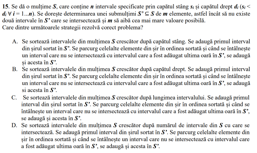 A. La fel ca la Spectacole, dacă sortăm după începutul intervalului, putem alege eronat, un interval care începe devreme dar se termină foarte târziu FALS B. Asta este soluția de la Spectacole, sortând prin finalul intervalului, ne asigurăm că întotdeauna alegem varianta care se termină cel mai repede ADEVĂRAT C. Este o metodă eronată de a rezolva, deoarece nu doar lungimea intervalului este relevantă. În cazul ilustrat, deși intervalul roșu are cea mai scurtă lungime, intervalele verzi sunt alegerea optimă FALS D. Numărul de intersecții cu alte intervale ne duce din nou pe o cale eronată, deoarece un interval mic se poate intersecta cu multe altele. De exemplu, punctul de început poate avea multe intervale care se intersectează și cel mai mic interval de acolo va avea foarte multe intersecții, dar tot va fii varianta optimă (Vezi desenul de mai jos) FALS
